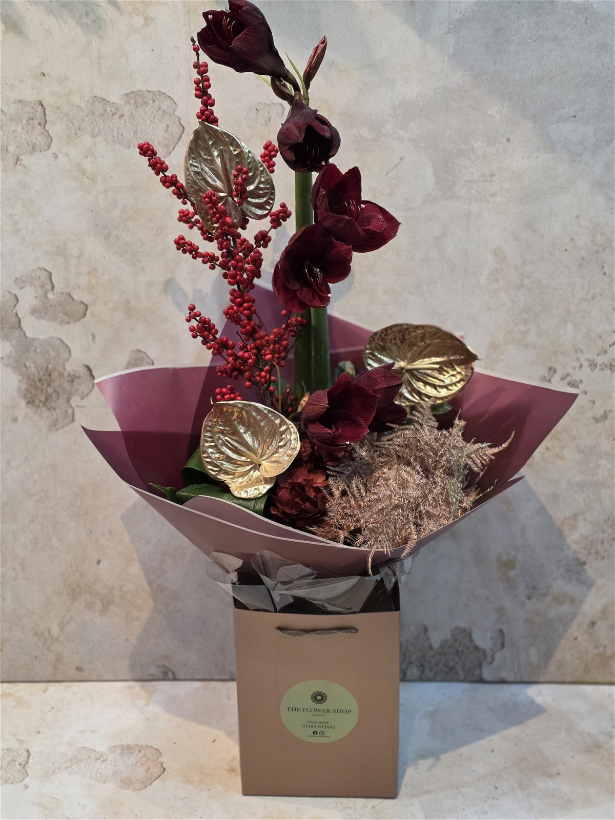 Dramatic, modern, and beautifully composed, this bouquet delivers a rich crescendo of colour and form—perfect for gifting, decorating, or adding a touch of theatrical Christmas magic to any space.