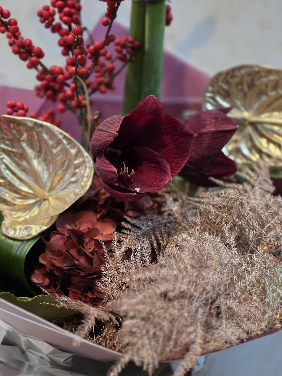 Striking and full of festive rhythm, our 11 Pipers Piping bouquet captures the bold energy of the season. Deep burgundy amaryllis rise like elegant pipers, creating a tall, melodic silhouette, while vibrant red berries add lively movement throughout the design. Shimmering gold anthurium leaves and soft, feathery textures bring a luxurious festive flourish, echoing the sparkle and flair of pipers in celebration.