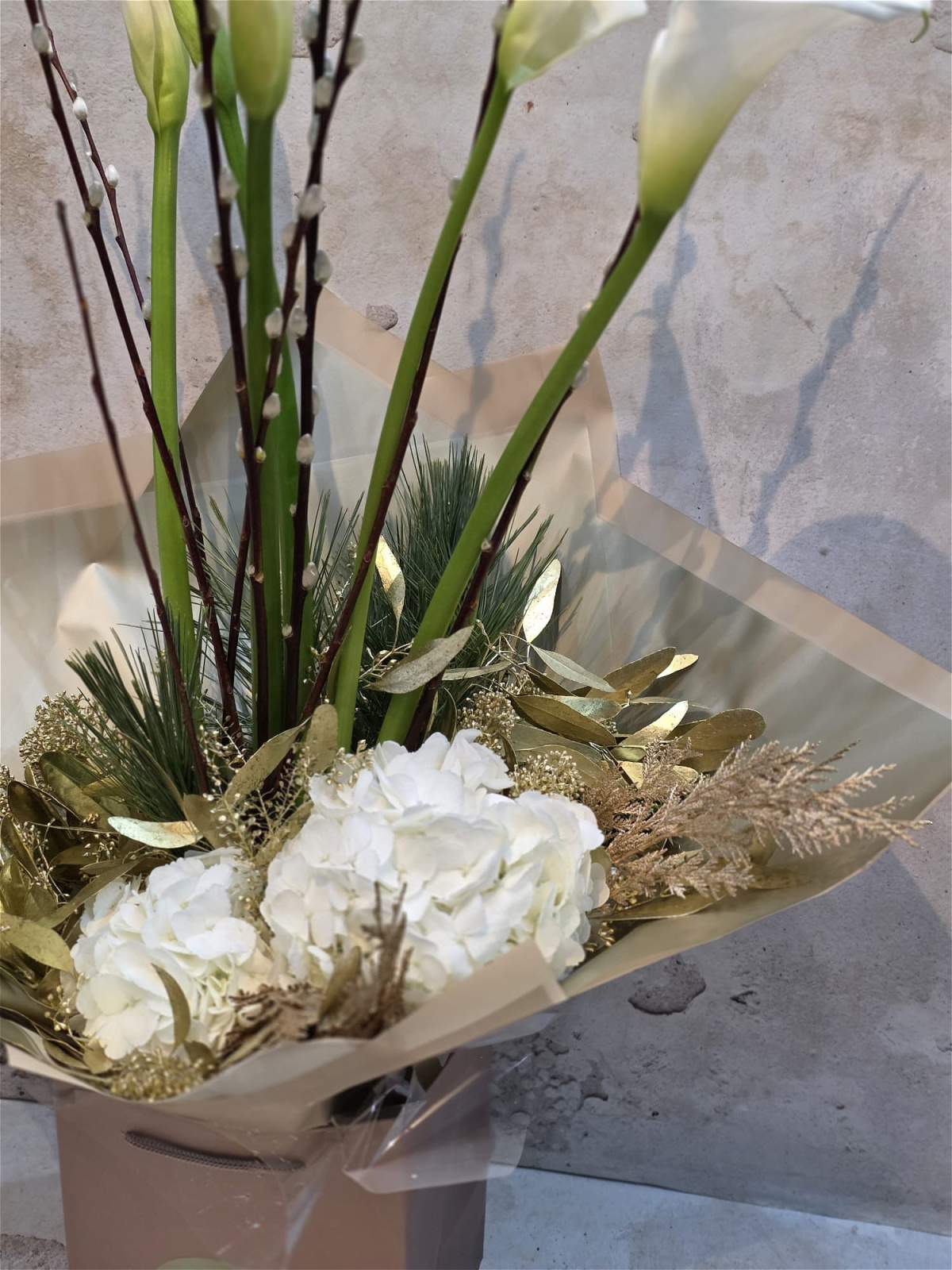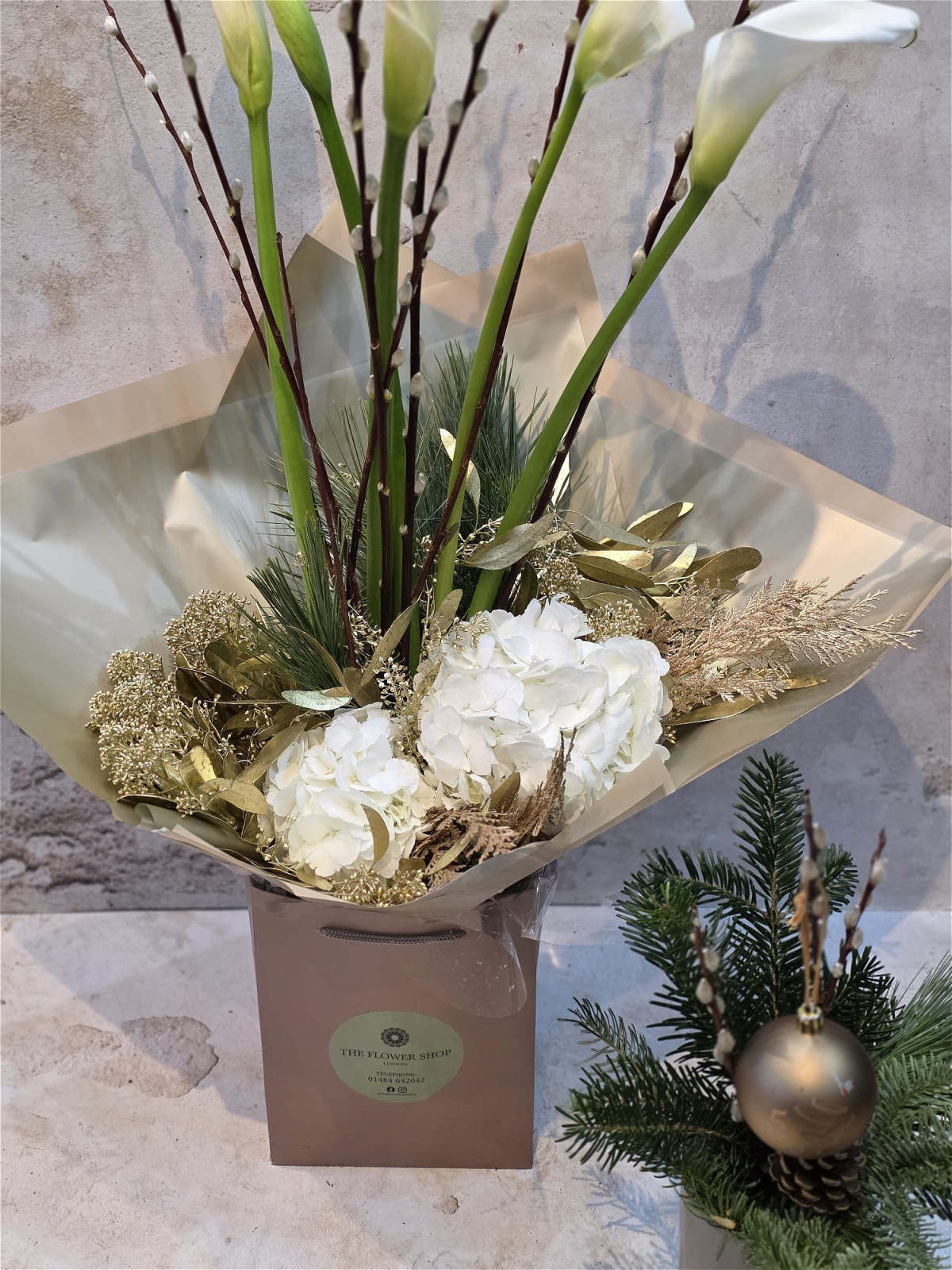 Inspired by The 12 Days of Christmas, this elegant bouquet features tall, sculptural calla lilies rising above soft white blooms and golden seasonal accents. Textural branches add a wintery touch, while the warm champagne wrapping completes the look. A refined, modern nod to the “Five Golden Rings,” perfect for festive gifting or holiday décor.