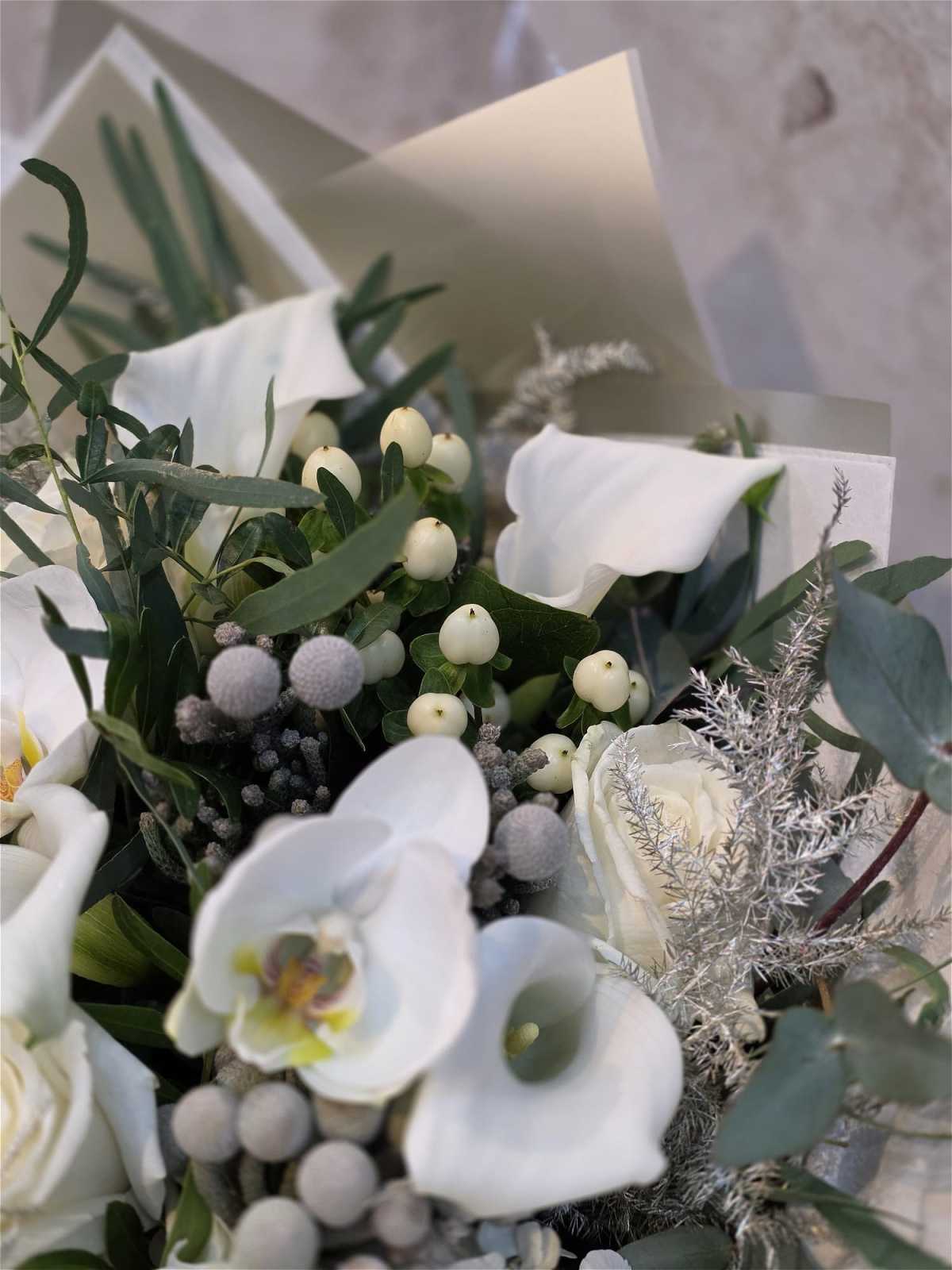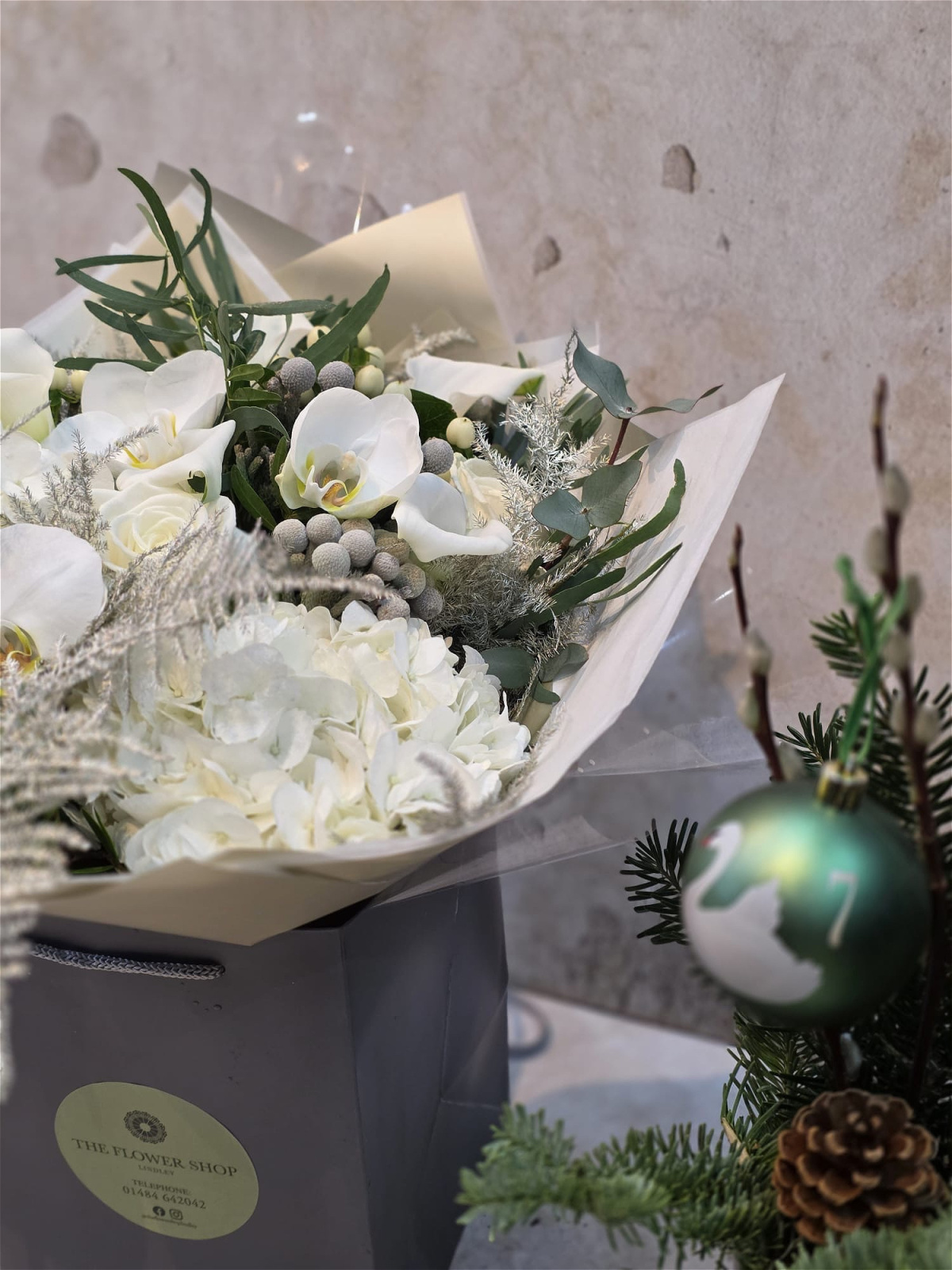 Inspired by the grace and purity of “7 Swans a-Swimming,” this serene bouquet captures the elegance of winter’s most regal bird. Clouds of white hydrangea and sculptural white orchids create a soft, flowing silhouette, echoing the gentle movement of swans gliding across water. Cool grey foliage adds a refined, icy undertone, enhancing the bouquet’s tranquil, wintry feel.
