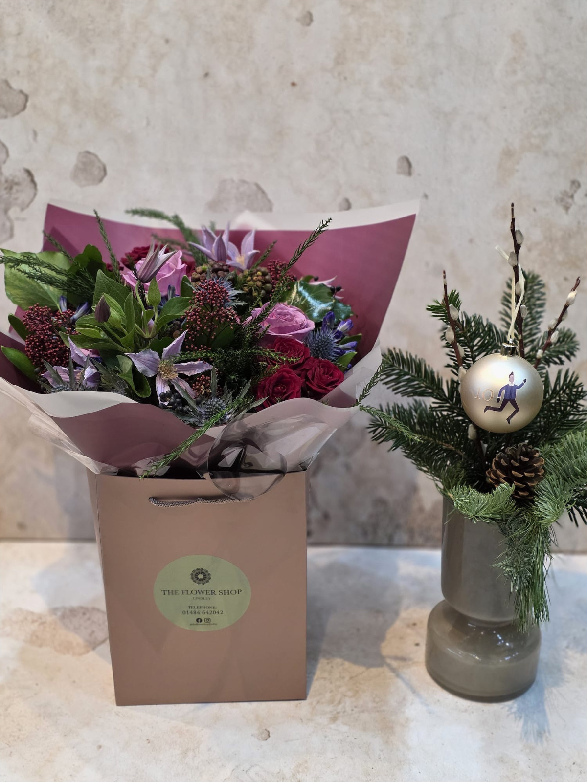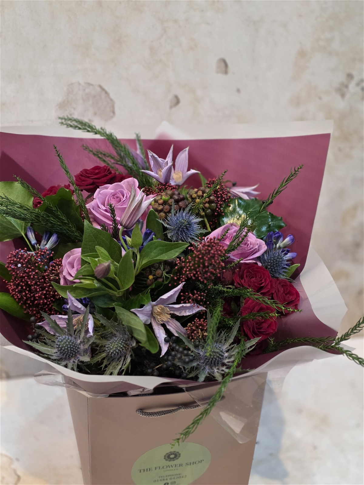 Colourful, expressive, and beautifully layered, this bouquet brings a touch of drama and celebration to the season—perfect for gifting or adding a lively accent to any Christmas setting.