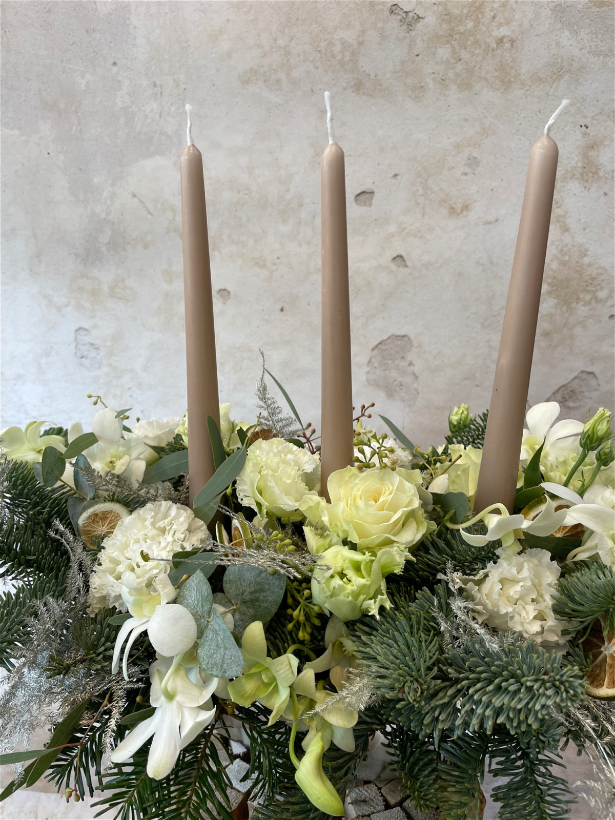 Silver tin with 3 candles, filled with Christmas foliage, orchids, lisianthus, roses and fresh eucalyptus.