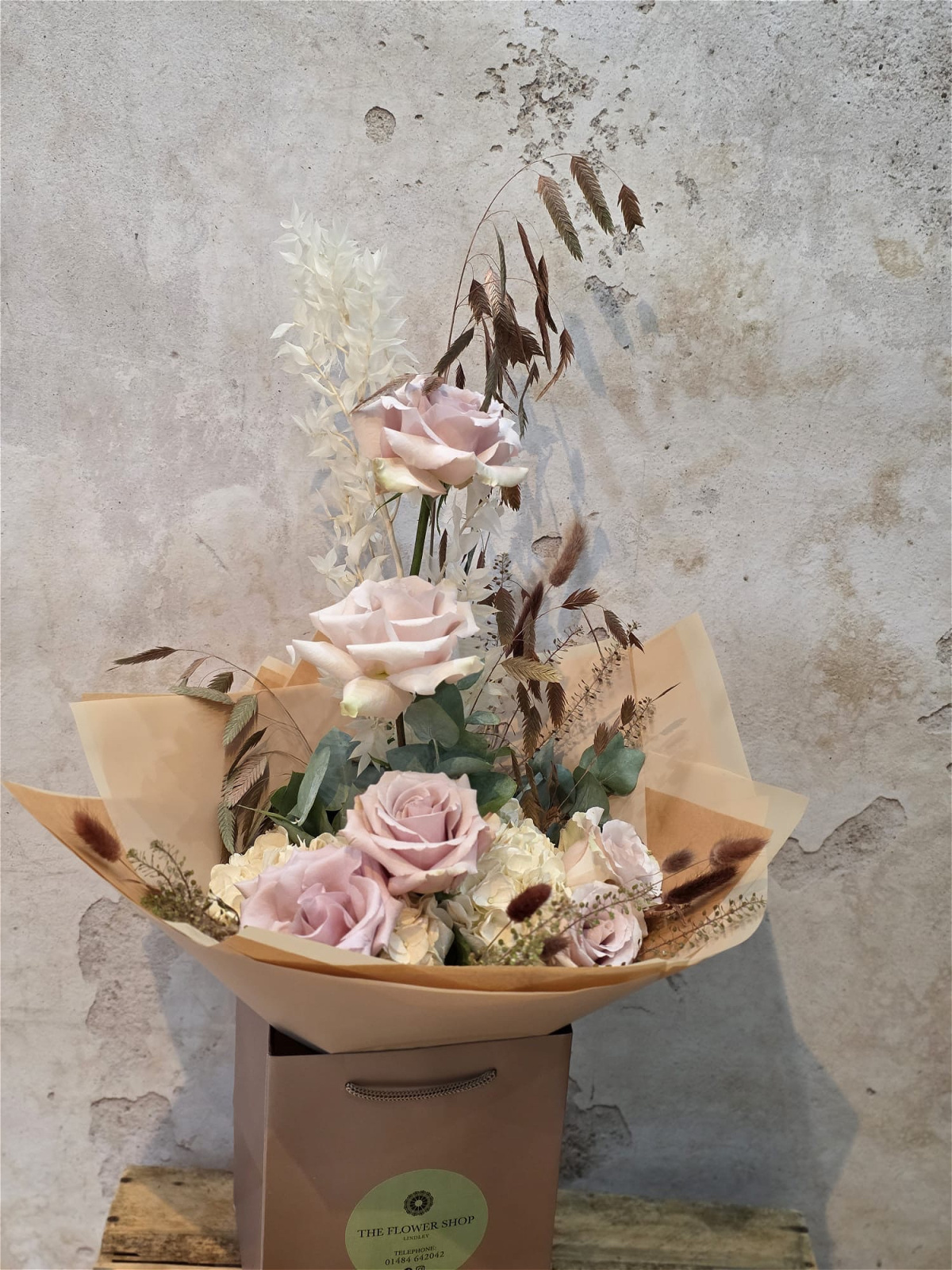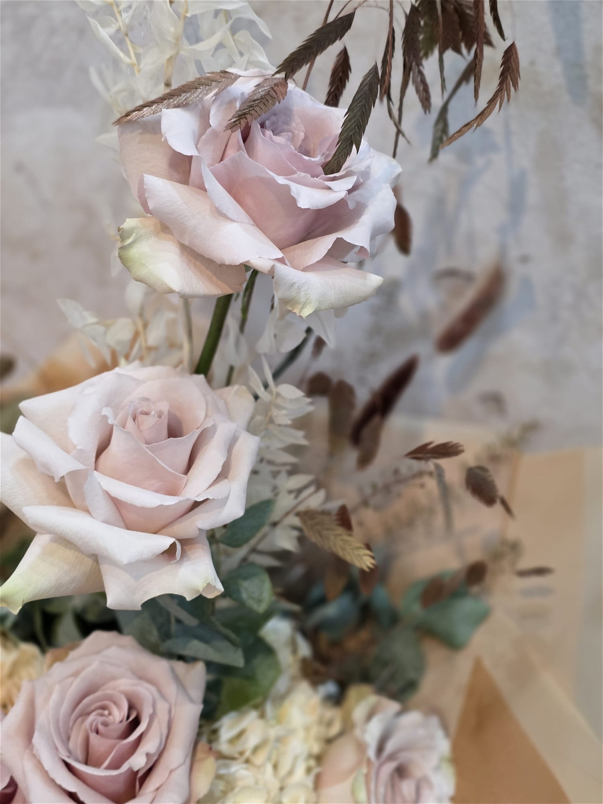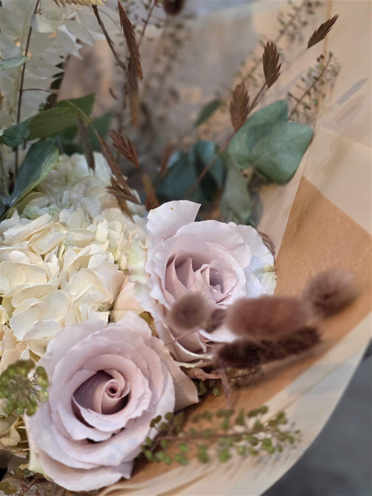 A bouquet that captures the cozy elegance of autumn. Soft, muted blush roses are beautifully paired with creamy hydrangeas, delicate dried grasses, and foliage in earthy tones, creating a timeless and romantic arrangement. Inspired by the comforting hues of a steaming chai latte, this hand-tied bouquet brings a touch of warmth and calm into any space.