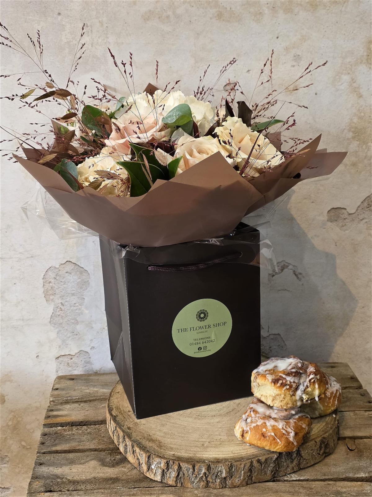 A bouquet as warm and indulgent as a freshly baked treat. Cinnamon Bun from our AUTUMN PANTRY collection is a rich medley of velvety cream blooms, soft blush roses, and earthy greenery, accented with wisps of cinnamon-toned foliage. Wrapped in deep mocha paper and presented in our signature bag, it evokes the comforting aroma and cozy feel of a bakery on a crisp morning. Perfect for gifting or styling at home, this bouquet adds a dash of warmth, elegance, and understated luxury to any setting.