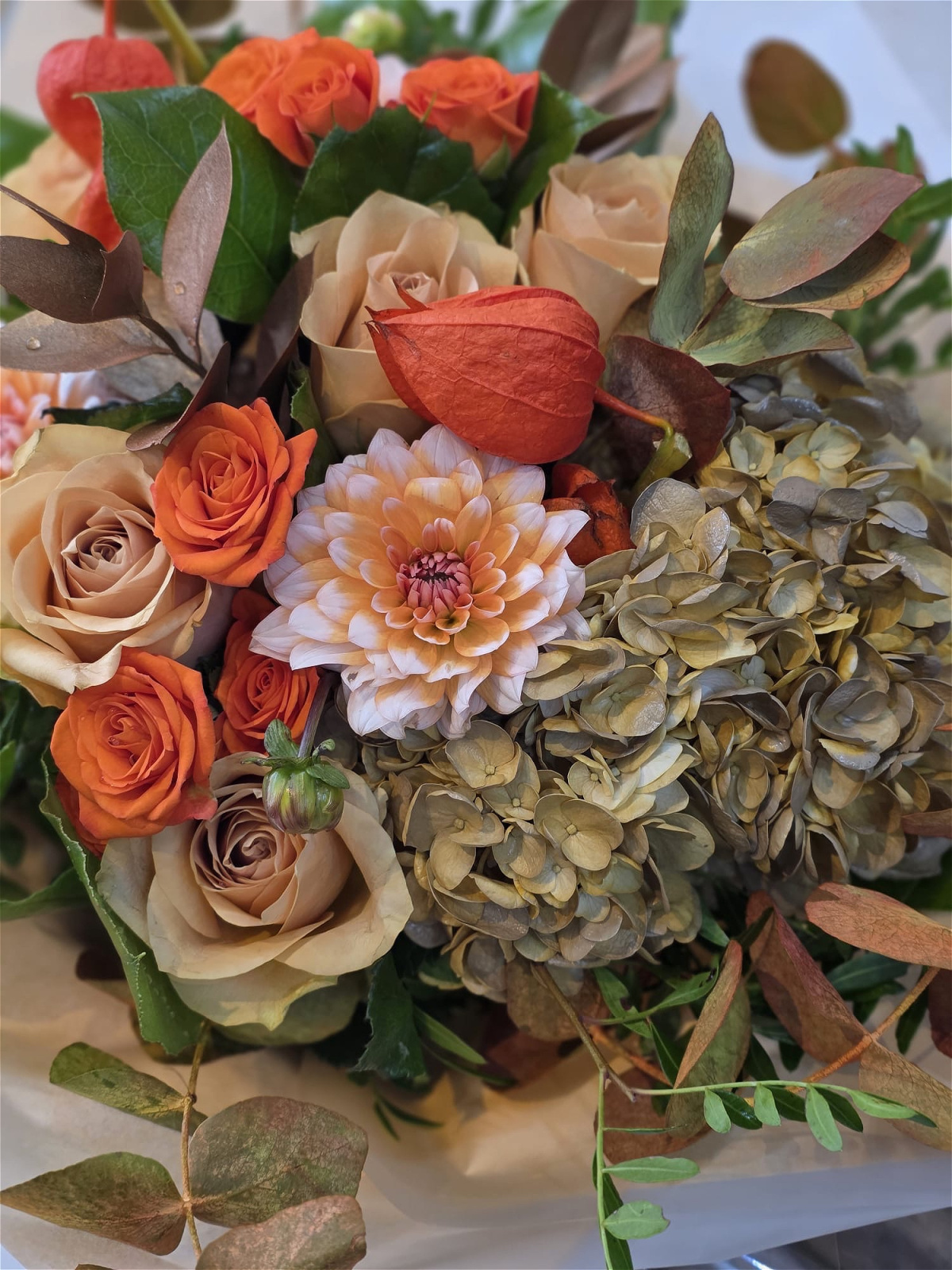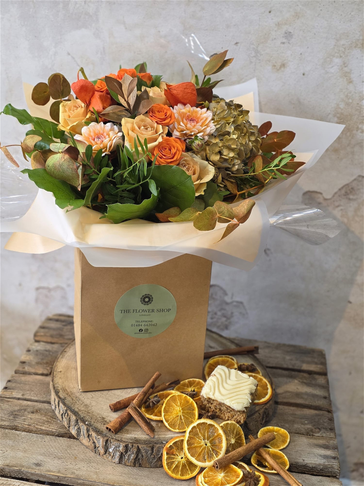 A slice of autumnal indulgence, beautifully arranged. Spiced Carrot Cake from our Florist Pantry collection is a vibrant, textured bouquet inspired by the warmth of home baking. This arrangement layers velvety caramel roses, burnt-orange spray roses, and creamy peach dahlias with rustic bronze foliage, dried textures, and aromatic greenery reminiscent of cinnamon sticks and orange zest. Presented in our signature kraft bag, it’s a feast for the senses — a bouquet that smells of spice, feels like comfort, and looks as decadent as its namesake dessert. Perfect for gifting or bringing a cozy seasonal glow to your own home.