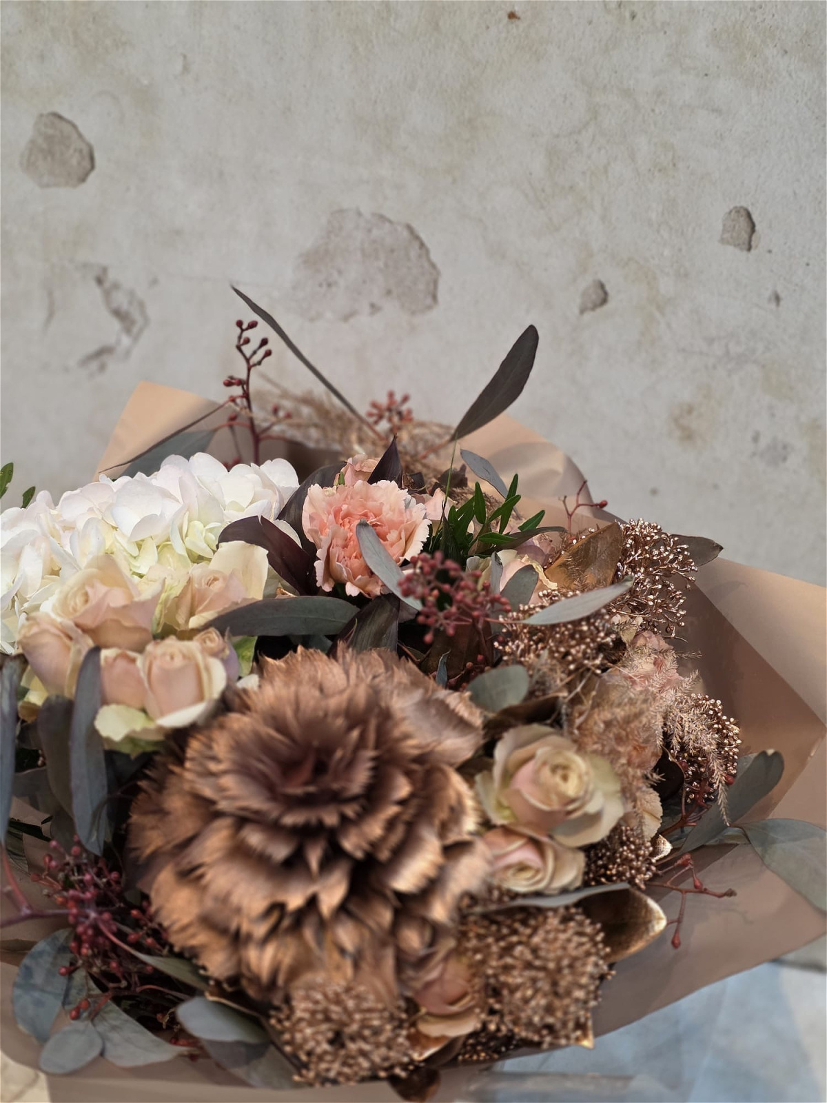Rich, warm and delightfully opulent, this bouquet is a celebration of French elegance. Cream and blush roses, soft white hydrangea and delicate carnations are layered with bronze-toned blooms, copper textures and winter foliage. The palette of champagne, caramel and soft blush evokes timeless sophistication — a luxurious nod to the charm and beauty of three French hens.