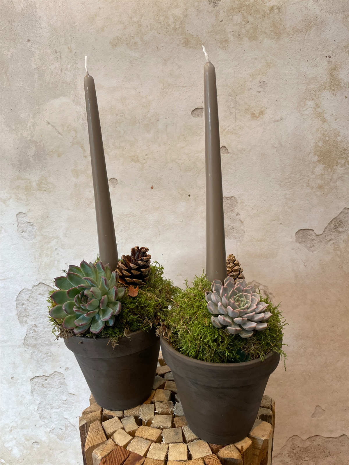 Single candle with a succulent and cone, ready for the centre of your Christmas table.