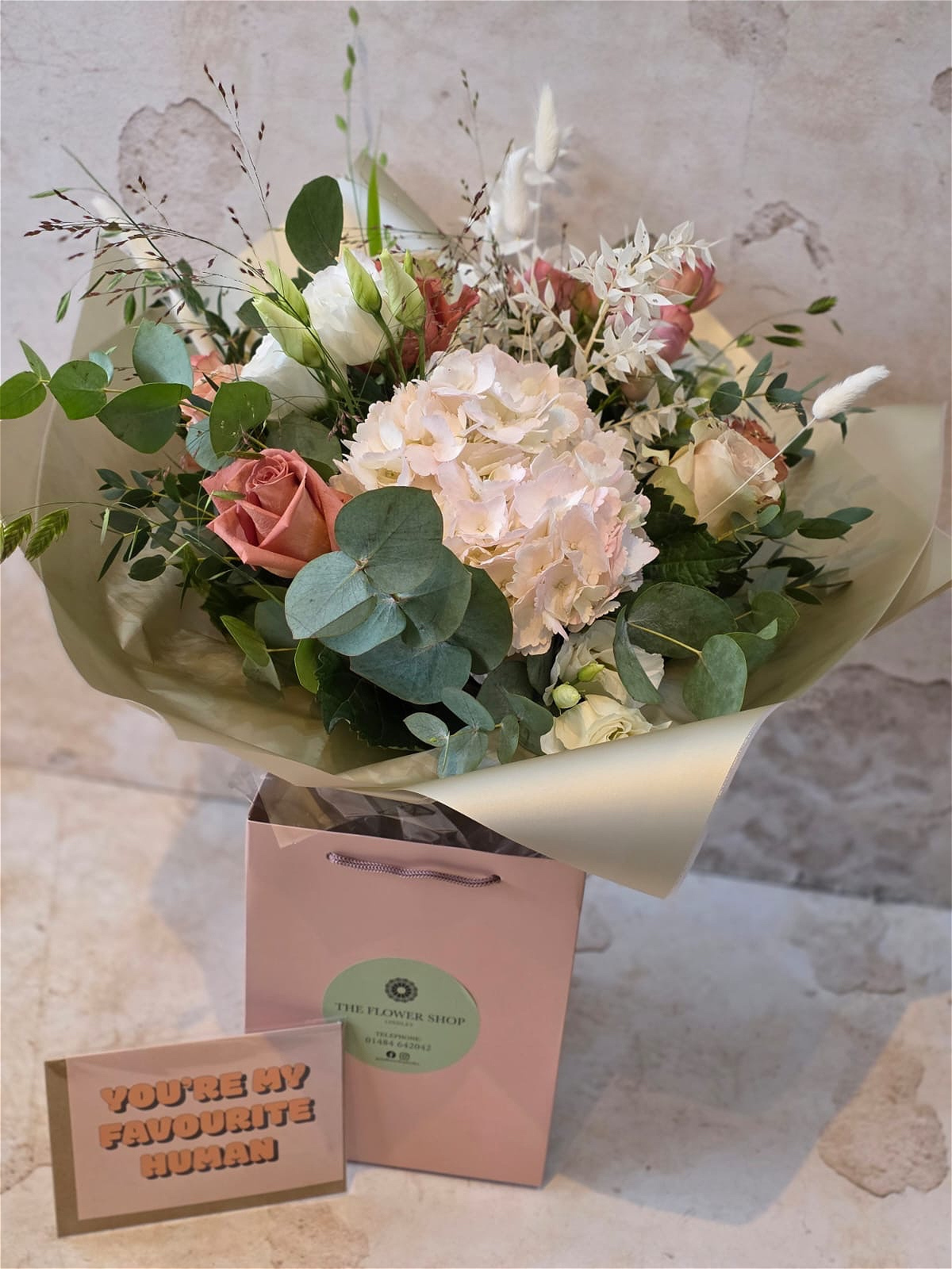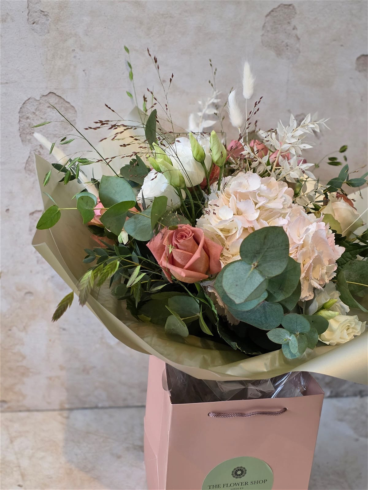 At the heart of the design sits a stunning hydrangea, surrounded by romantic roses, delicate seasonal blooms and fresh eucalyptus foliage. Light, airy accents add movement and texture, giving this arrangement its effortlessly chic look.