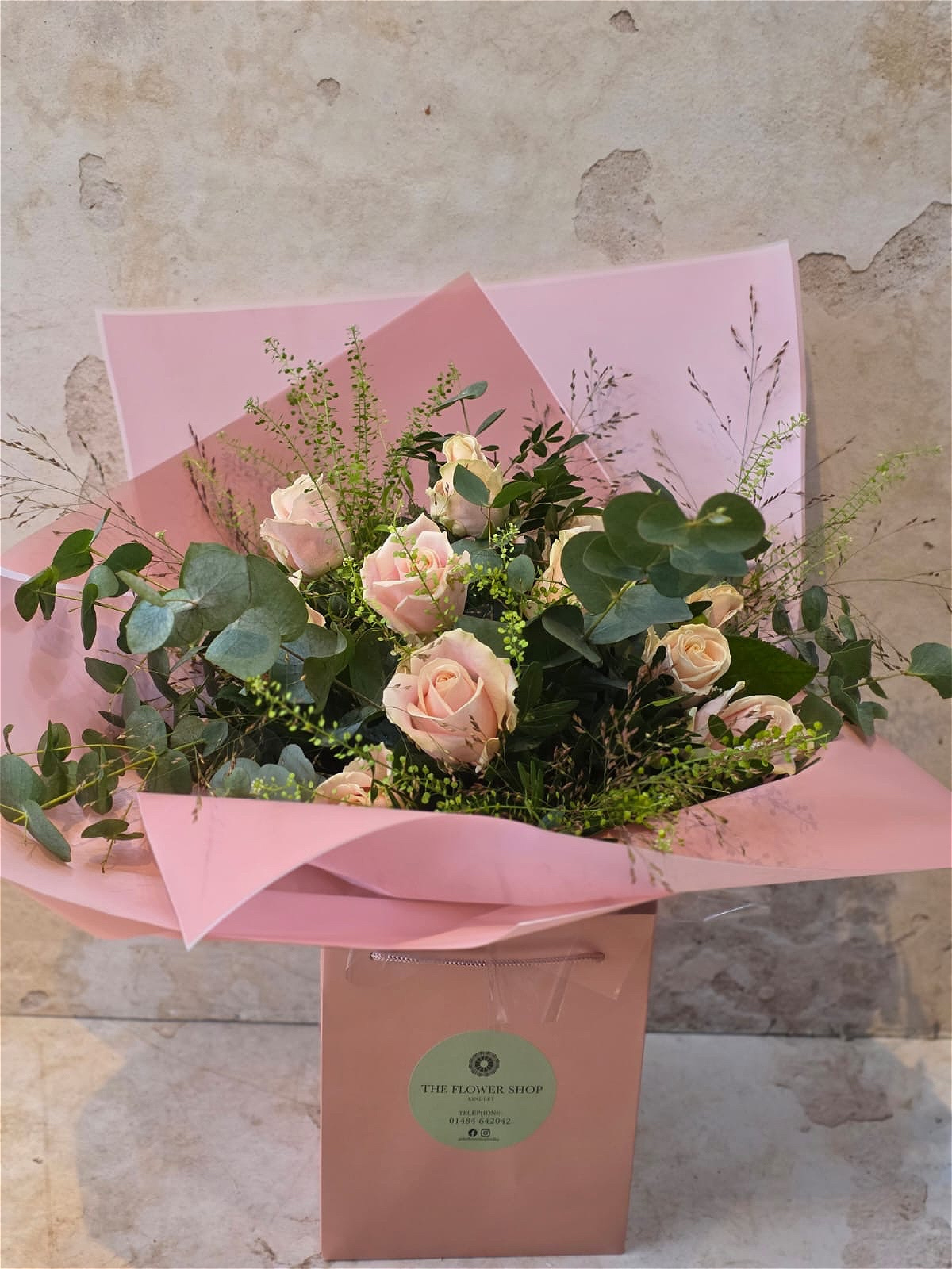 Featuring twelve soft blush pink roses nestled amongst fresh seasonal foliage and delicate textural stems, this bouquet creates a natural, garden-inspired look that feels both classic and effortlessly stylish. The gentle pink tones paired with lush greenery make it a perfect choice for showing appreciation, gratitude and love.