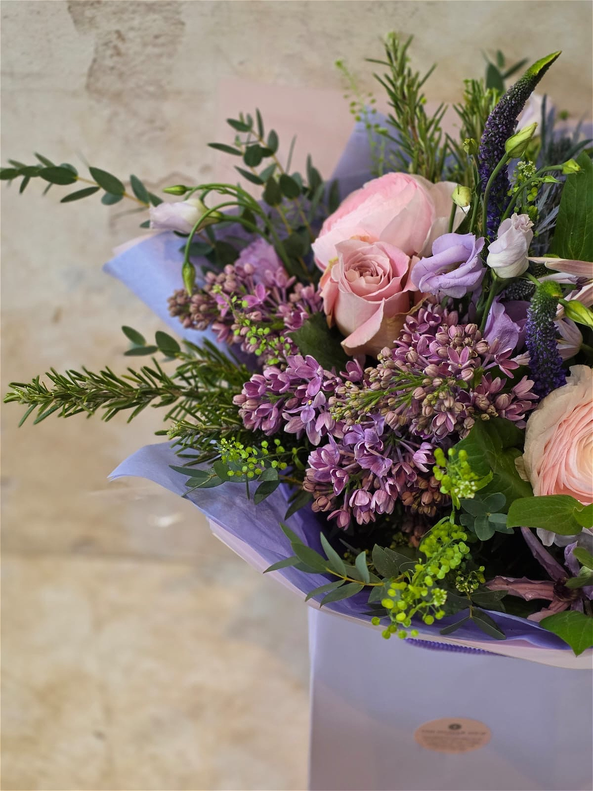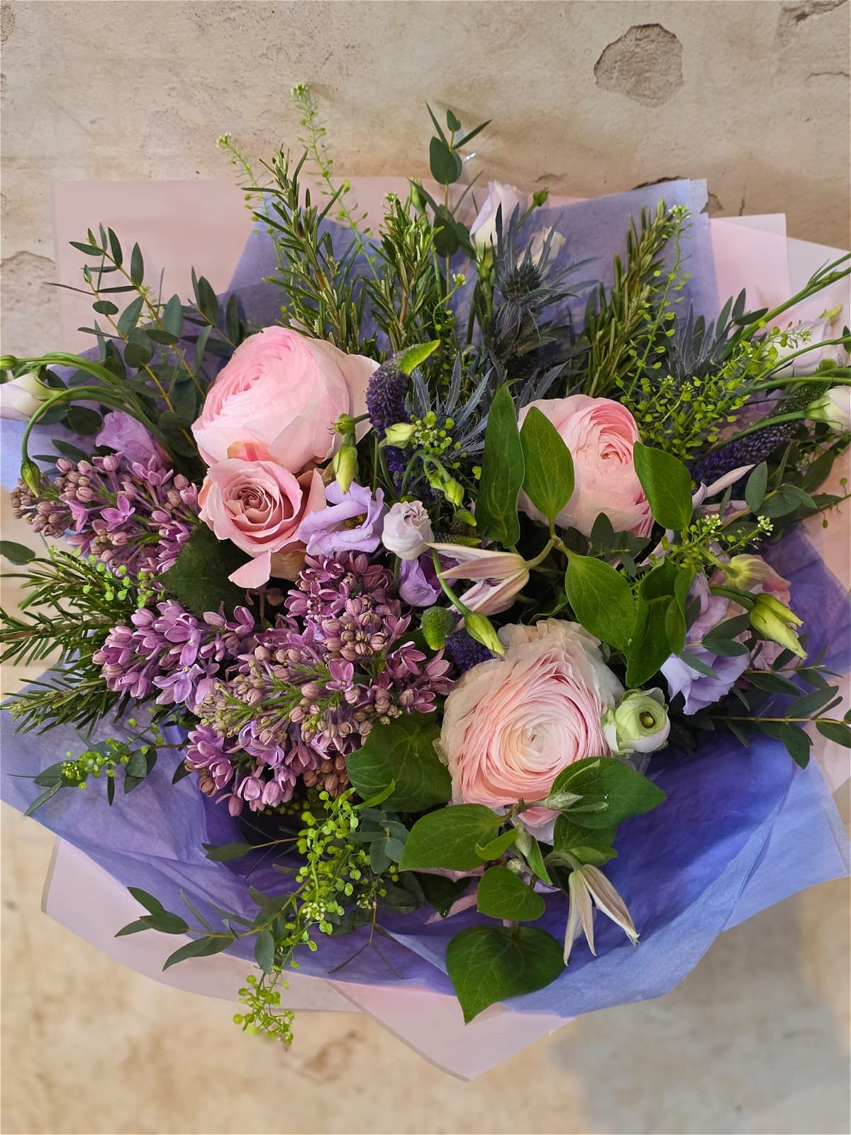 Featuring a romantic mix of soft pink roses, ranunculus, lilac tones and textured seasonal flowers, all nestled amongst natural foliage, this bouquet has a loose, garden-gathered feel that is both elegant and effortlessly beautiful.