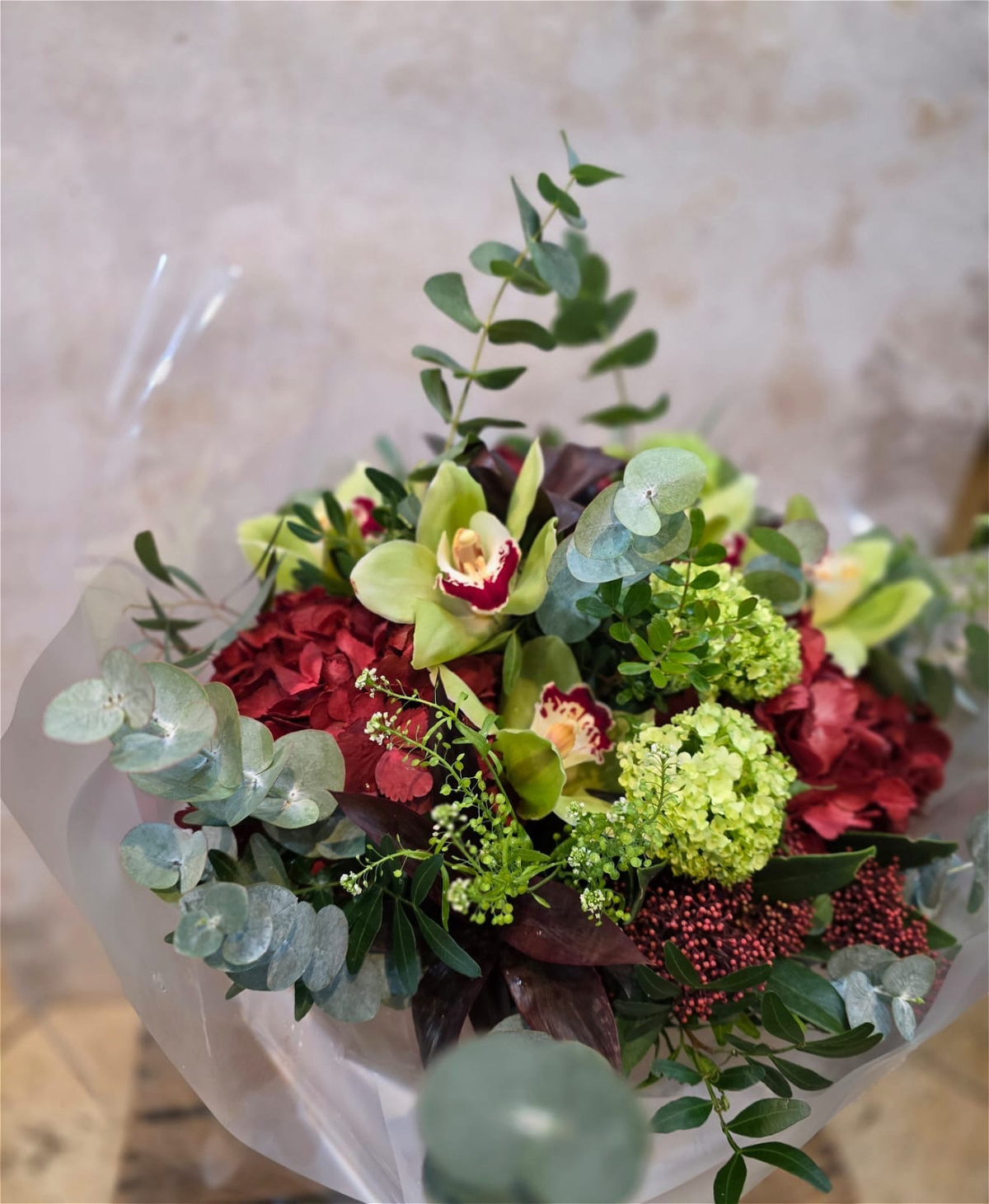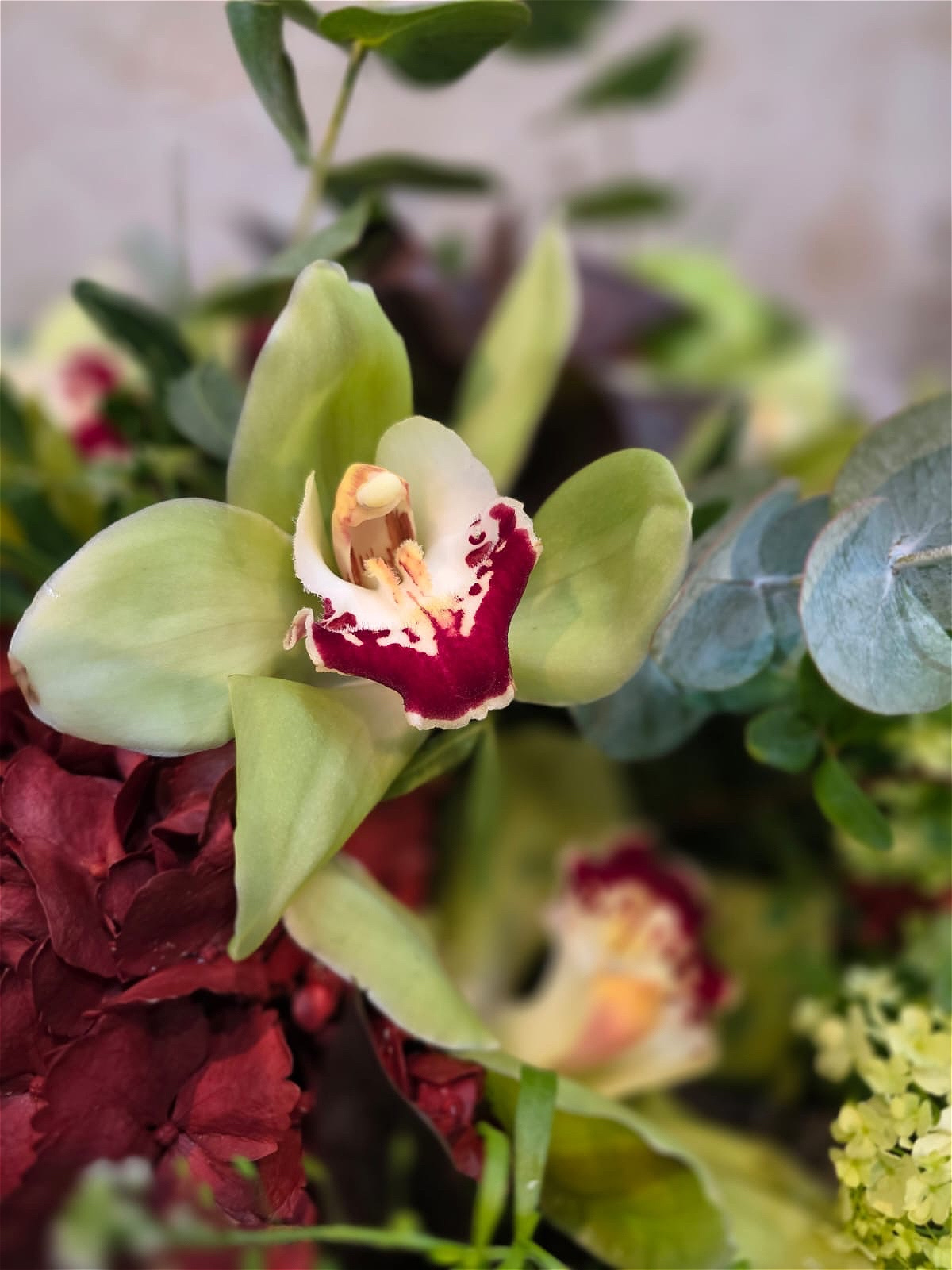 Wildly Yours is a bouquet for love that refuses to be ordinary. Deep burgundy blooms mingle soft eucalyptus, striking cymbidium orchids and other hand chosen flowers, creating a lush contrast that feels both grounded and unexpected.